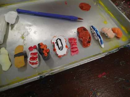 4年生は「お気に入りのお店」に並べる品物を作っていました。みんなとても丁寧に作業していて、まるで本物の様に見えました。たくさんの素敵な作品の一部を紹介します。