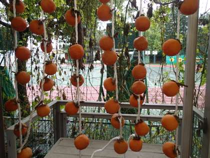 来週の水曜日に3年生が干しがき作りをします。その準備として、縄に干しがきを干す準備をしました。きれいなつるし柿ができました。