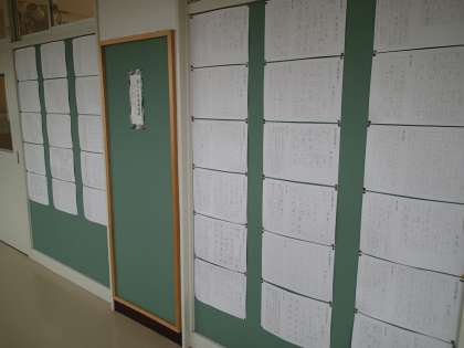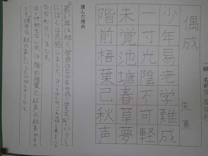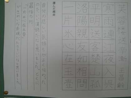 5年生の廊下の掲示板に「教科日本語」で学習した漢詩を視写したものが掲示されています。感想もさすが高学年らしく、しっかりと読み取ってまとめています。