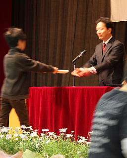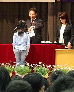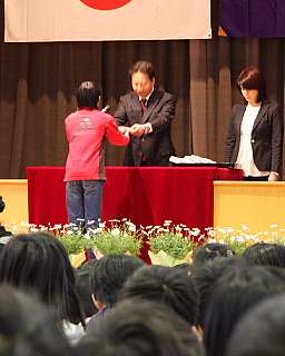 次に、各学級の代表に学校長から修了証が手渡されました。卒業式の設営がされた体育館の壇上で行われたため、いつもより厳粛な雰囲気に、子どもたちも緊張気味でした。