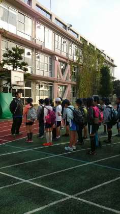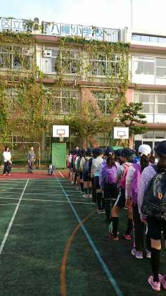 6年生が朝早く、連合運動会の会場、総合運動場へ向かいます。練習の成果を発揮できるようマナーの指導もありました。