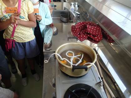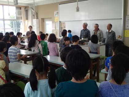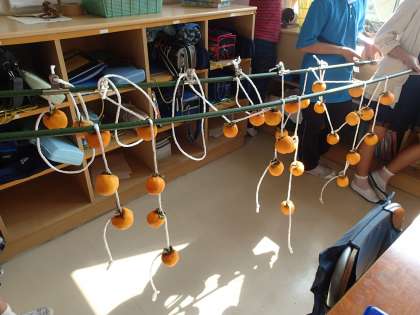 むいた後にお湯に入れるところは先生方がやりました。みんなは一緒に数を数えていました。お湯につけた後は棒につりさげ、教室に運びます。今日、お手伝いいただいたGPSの方々に感謝のご挨拶をして終わりました。