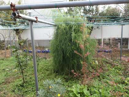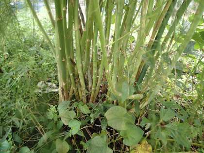 八幡ファームでは3か所でアスパラが育っています。これは一番大きく育っているアスパラの塊。緑のドームが伸びています。下をかき分け覗き込んで見ると、そこにはアスパラの茎が見えてきます。取り立ては生でも食べられますが、そろそろ新芽は終了。これからは地下茎を太らせる時期に入ります。