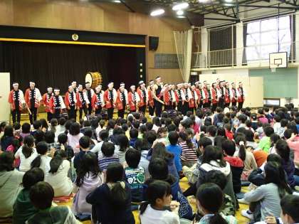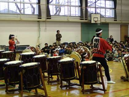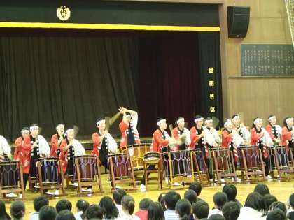 和太鼓をたたくにはかなりの体力が必要です。同じリズムでたたき続け、強弱で表現します。また他のメンバーと合わせることも大切です。指揮者はいません。音を聞きながら、また声を掛け合いながら演奏していきます。録音では到底表せない音圧を感じながら、八幡小の児童は開校記念コンサートを楽しむことができました。