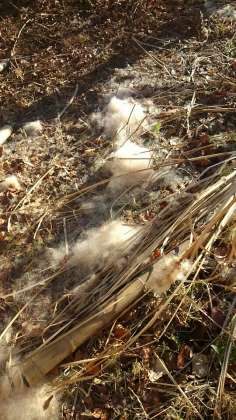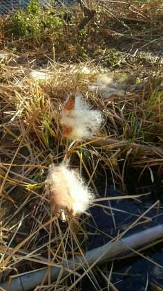ビオトープの池の回りにガマが有ります。今は穂が綿のようになり風がふくと、飛んでいきます。1年生が見学に来ました。