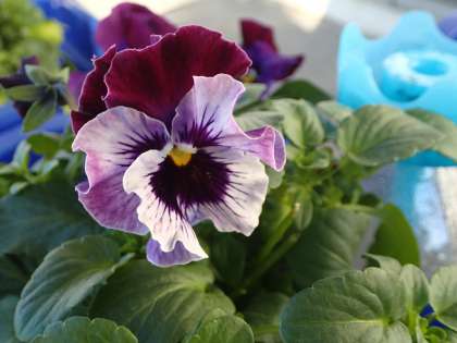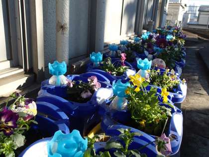図工室の前には一年生が育てているパンジーが。お日様の光をたっぷり浴びて元気いっぱいに咲いています。