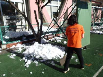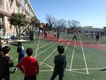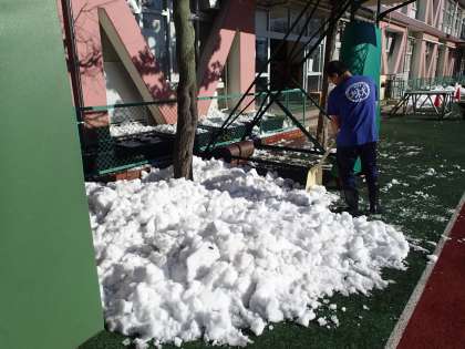 昨日降った雪を陽の当たる場所に運びました。これで子どもたちも滑ることはありません。今日は天気がよかったので、子どもたちも元気いっぱい、校庭で遊んでいました。
