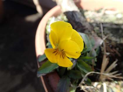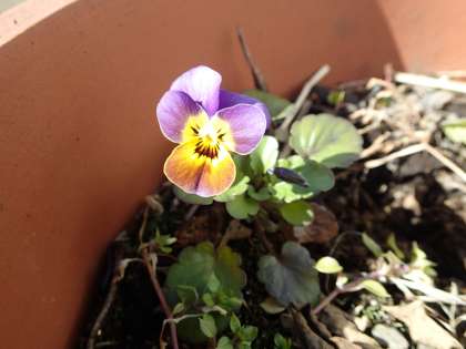 八幡ファームでは、昨年ビオラを育てていました。そこに2輪の花が咲きました。ひと冬を越え、誰の世話を受けたわけでもなく、じっと寒さに耐えて咲いたこの花。愛おしささえ感じてしまいます。