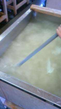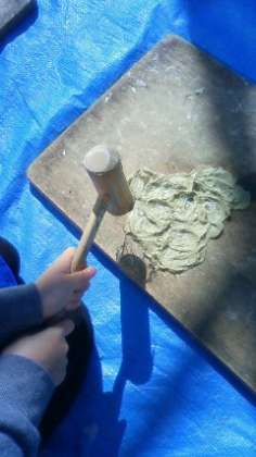 紙の原材料であるこうぞを叩いていきます。たくさん叩いていますが、考えているような紙にはなりません。さて、そのこうぞをすき舟に入れて撹拌します。