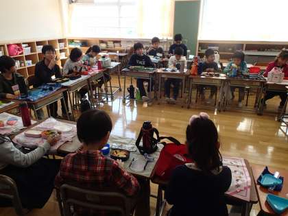 今日は「お弁当昼食」の日です。各自、家庭からもってきたお弁当を縦割りで食べる日です。