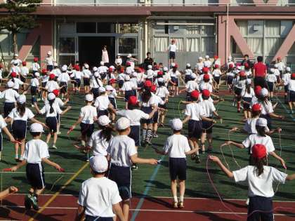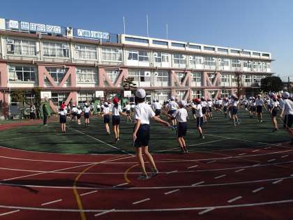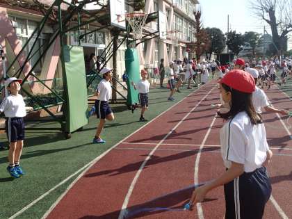 体育朝会で、短縄跳びをやりました。何回かやったら足のジャンケン!みんな楽しそうに練習していました。