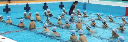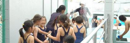 ところで、写真を見て、プールの水位がずいぶん低いのにお気づきですか。これは、子どもたちの安全を考えて、学年に応じて水位の調節をしているからです。