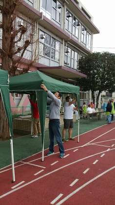 4時からおやじの会、同窓会主催のBBQ 大会が行われます。焼きそばやBBQ の炭火おこし、テントやライト等、準備をしてくださっています。卒業生のボラ会も手伝っています。