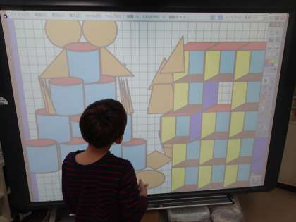 電子黒板を使って1年生の算数の学習の発展で、パズルの学習をしました。色々な形を使って、コピーをしたり、伸ばしたり、縮めたりしながら、自分の考えた絵を作り上げました。