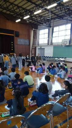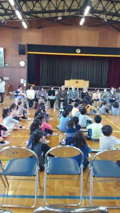 給食のお手伝いをしてくださった方や同窓会の方、地域の方を御呼びしました。1年間の成長を見ていただくために、合奏、合唱を披露します。この後、教室で一緒に給食をとります。