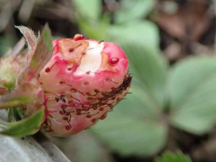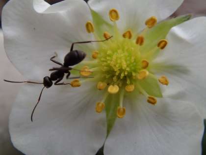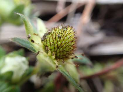 イチゴの花が咲いています。それだけではなく、実までなっています。ただし虫たちにとっても御馳走。ボロボロにされてしまいました。もう少し暖かくなると、たくさん実をつけてくれます。