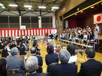 始業式の後、平成28年度入学式でした。美しい桜の花が咲き誇る中、53名が入学しました。6年生が式に参加し、2年生が歓迎の言葉と歌、演奏を披露しました。