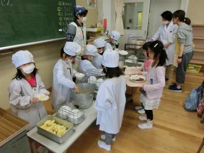 給食当番は緊張しながら友達の分を準備しました。