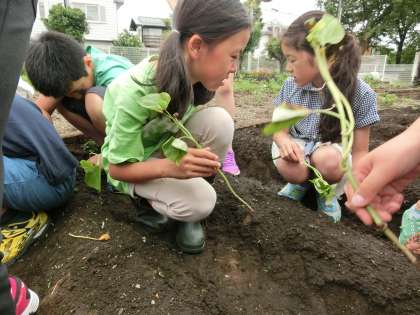 今回は、畑で育てるサツマイモを植えました。