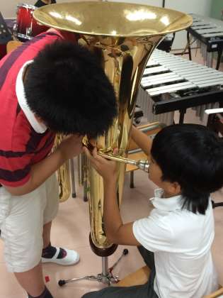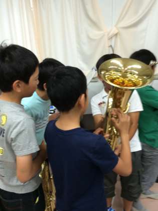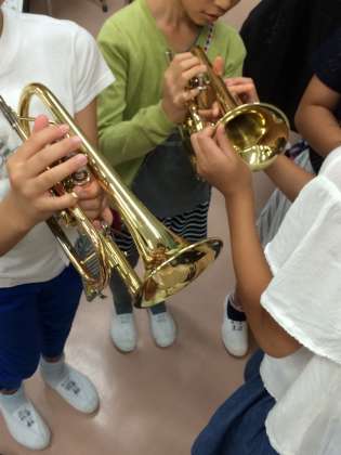 5・6年生の先輩たちに楽器の持ち方などを教わりながら、