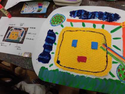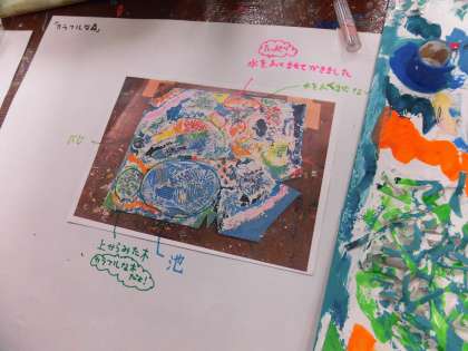 自分の作品の写真の周りに書いた解説と作品を合わせて