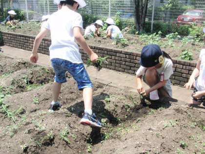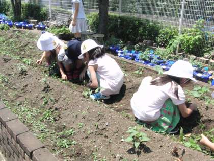 サツマイモのハート形の葉を抜かないように気を付けながら、