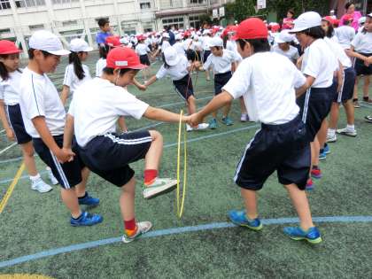 前後の人と手をつないだ状態で、フラフープをくぐり、
