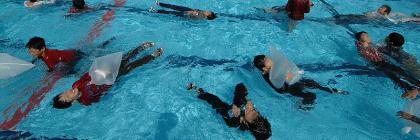 〜つづき〜次は、服を着たまま泳ぐ体験をしました。クロールでは思ったように泳げません。平泳ぎか犬かきが結構楽なようですね。とにかくじたばた体を動かし過ぎないようにして、ゆっくり手足をかいて泳ぐことが体力の消耗を防ぐことを学びました。最後は、足が着かないようなところで(たとえば海の上などで)長時間浮いているためにどうするかを学びました。仰向けになり体の力を抜くと浮かびます。今日は「浮き」としてペットボトルとゴミ袋を使って見ました。最初なかなかリラックスができずばたばたしていましたが、練習の甲斐あって、最後のほうではみんなゆったりと落ち着いて浮いていられるようになりました。