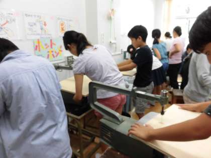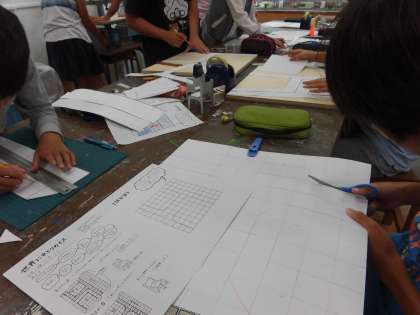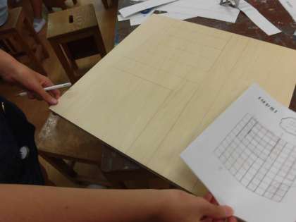 設計図を元に実物大の型紙を作り、木材に線を引きました。