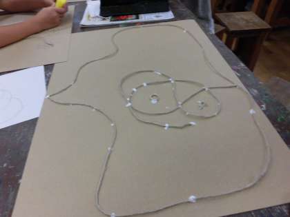 土台の厚紙に、麻ひもをボンドで張り付けていきます。