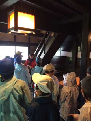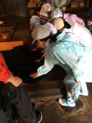 茅葺き屋根の古民家では、熊の毛皮を皆で触りました。