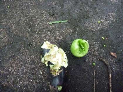 そして今は、「ナス」、「トマト」がカラスに狙われています。昔は少し色づいてからつついてきたのですが、この頃は青いうちから食べてしまいます。また、無理をしてとろうとするので、枝がおれてしまうこともあります。