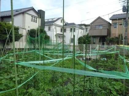 カラスよけにはいろいろ試しましたが、学校ではスズランテープが一番効くようです。棒とスズランテープを網の目の様に張り巡らし、風でなる音でも嫌がるようにしています。昨日は20羽以上が押し寄せていた学校園ですが、今日はほとんどカラスはいません。この調子で野菜や果物が順調に育つことを願っています。