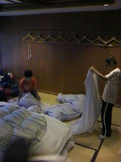 朝会後、朝食の前に寝具の片付けや荷作りを進めていきました。