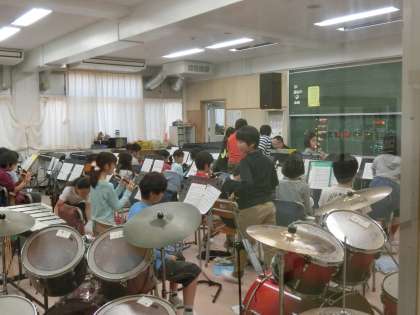 2クラス合同で、互いの音を聴き合うようにもしています。