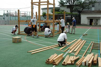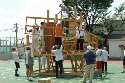 控え室や本部の設営、そして一番大変なのがやぐら組みです。本校の倉庫に保管してあるやぐらの部品を手順に従って組み立てていくのですが、この手順が難しくて・・・午前中から照りつける日差しの中で、大汗をかきながら作業してくださり、おかげさまで2時間あまりでやぐらと提灯のセッティングが終わりました。ありがとうございました。