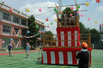 19日(土)、毎年恒例の九品仏地区「盆踊り大会」が本校の校庭で開かれました。朝9時から、本校はもとより、九品仏小、八幡中関係の地域、PTA、中学生ボランティア、教員、おやじの会等多くの皆さんが集まり、準備が始まりました。