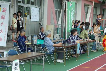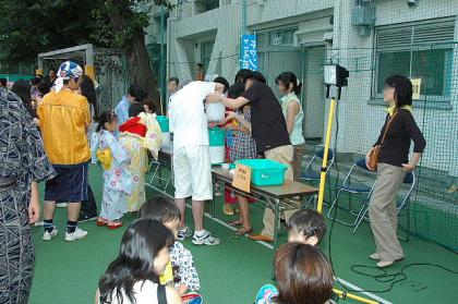 校内には地域・PTAの皆さんのお手伝いで、ゆかたの着付けコーナーもあり、ゆかたを持って訪れた子どもや大人が着付けをしてもらい、校庭にはゆかた姿の人がどんどん増え、いやがおうにも盆踊りの雰囲気が盛り上がってきました。