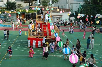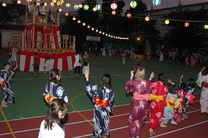 19日、午後6時、盆踊りの始まりです。盆踊り実行委員長と校長あいさつがあり、東京音頭からスタート。「和楽会」の皆さんを中心として自然に踊りの輪が出来上がりました。はなやかなゆかたすがたが盆踊り大会に色を添えます。