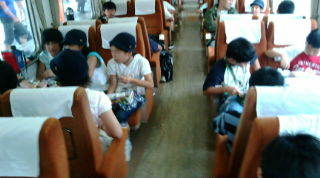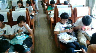 電車内で昼食。美味しいお弁当を作ったくれたお家の方に感謝!とても嬉しそうな子どもたちです。