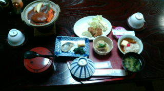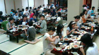 お風呂に入った後で、夕飯です。森の中の宿なので、外ではヒグラシの声が!みんな食欲旺盛です。