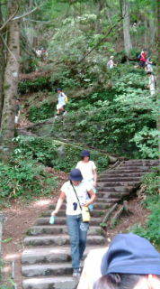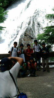 湯滝でグループごとに写真撮影。弁当を受け取って、再び出発!