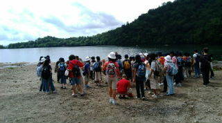 ハイキングスタート。グループごとに湯の湖畔を出発!