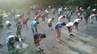 おはようございます。さすがに3日目ともなると、疲れがたまっているようで、朝からなんとなく眠そうな様子です。それでも緑に囲まれた爽やかな屋外で体操をして、気持ちがスッキリしました。