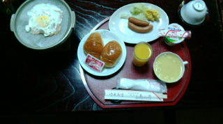 朝食です。今日の主食ははパンです。疲れ気味ですが、けっこう食べています。