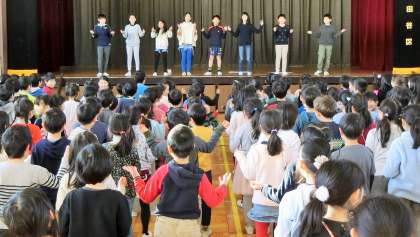 1月の児童集会は、英語で「もうじゅうがりに行こうよ」です。