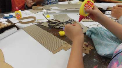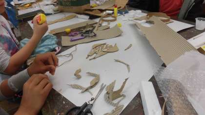 段ボールや紐や砂など、身の回りの材料を土台の厚紙に貼って