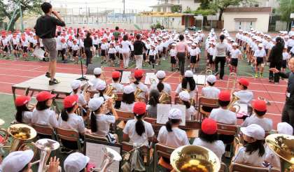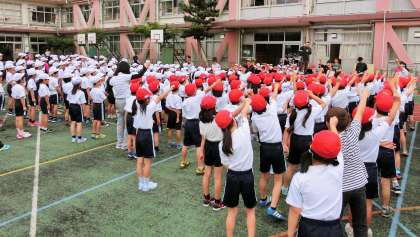 初日は、行進と歌、ラジオ体操の練習をしました。