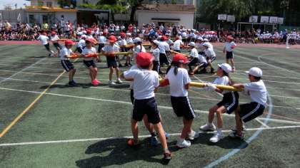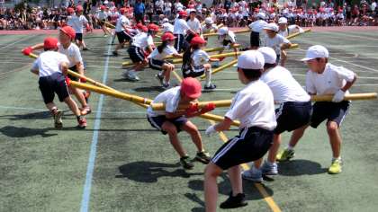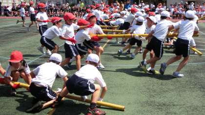 みんなで協力して、棒を自分たちの陣地へ引っ張りました。