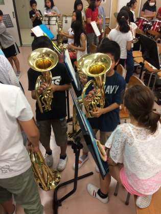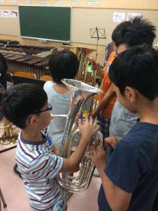 先輩たちもドキドキ。一生懸命に演奏の仕方を教えています。